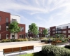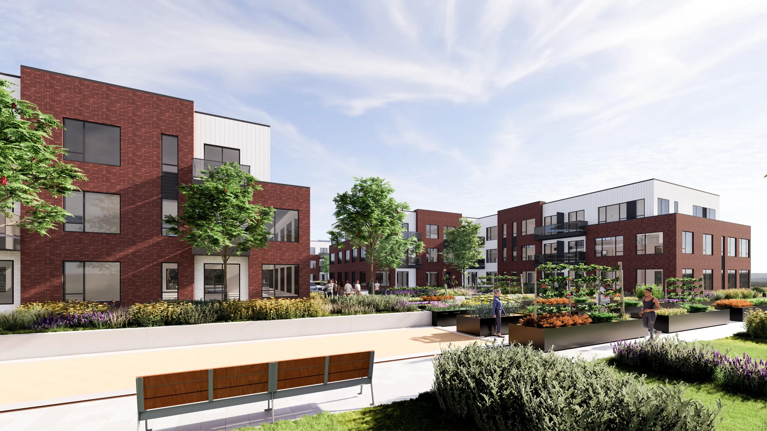 L’ensemble s’organise autour d’une grande cour intérieure verdoyante, véritable cœur du projet, où quatre immeubles s’élèvent harmonieusement : trois de trois étages et un de sept étages, et recréent l’atmosphère d’un village moderne.